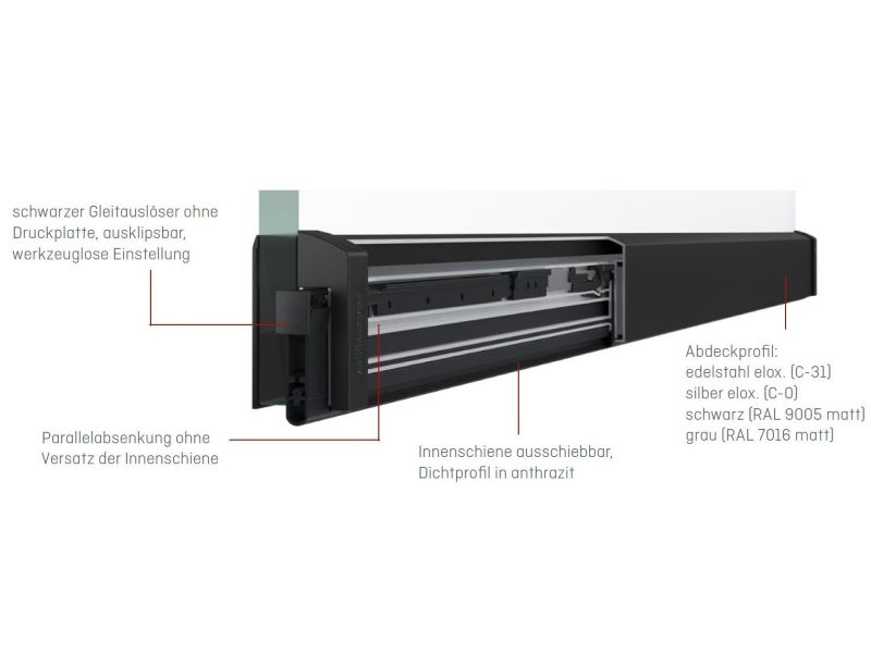 Für eine harmonische Türgestaltung haben wir die Abdeckprofile, neben den gewohnten Oberflächen C-31 (Edelstahloptik) und C-0 (Silberfarbig) auch in Schwarz (RAL 9005 matt) und Anthrazit (RAL 7016 matt) im Programm. Es wurde ein graphitgraues Dichtprofil und ein schwarzer Gleitauslöser verbaut.