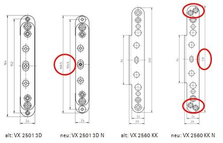 Charakteristisch für die N-Version ist die Diagonalverschraubung an den Winkelenden, wodurch die neue Ausführung sofort auch im montierten Zustand erkennbar ist. Entsprechende Frässchablonen sind wie unten aufgeführt neu zu berücksichtigen: