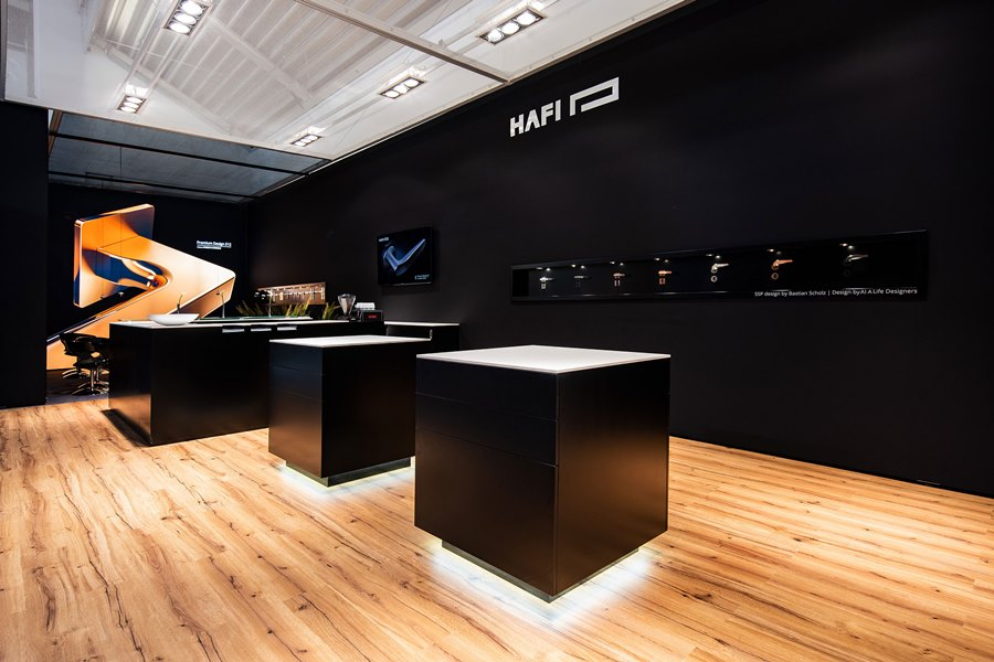 HAFI setzte das Spiel mit der Oberfläche prominent in Szene. Nicht nur die verschiedenen Nuancen der PVD-Behandlung, sondern auch die neue Soft-Touch-Oberfläche bringen Farbe in den Edelstahl-Alltag. Zudem standen die Premium Design-Modelle und die neue Anschlagtechnik Flush Line im Mittelpunkt. Insbesondere die Modelle 311 und 212, Design by Studio F. A. Porsche, bieten neben dem erstklassigen Design auch Oberflächentechnisch Neues – matt perlgestrahlte Drücker mit hochglanzpolierten Details.