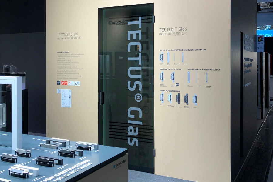 SIMONSWERK richtete den Fokus ganz auf das TECTUS Glas, welches sich mittlerweile zu einer ausgewachsenen Produktfamilie entwickelt hat. Neben der Bandvariante TEG 310 2D 80 mit einer Nennbelastung von 80kg wurden auch neue Oberflächenvarianten vorgestellt. Ein besonderes Highlight war die Kombination des abschliessbaren Schliessmagneten KC 25 Lock mit dem Griff KC 170 Lock, welcher ebenfalls ohne Glasbearbeitung montiert werden kann. Diese Lösung erlaubt eine unsichtbare Verriegelung von Glastüren und verfügt über eine Öffnungsfunktion im Notfall.