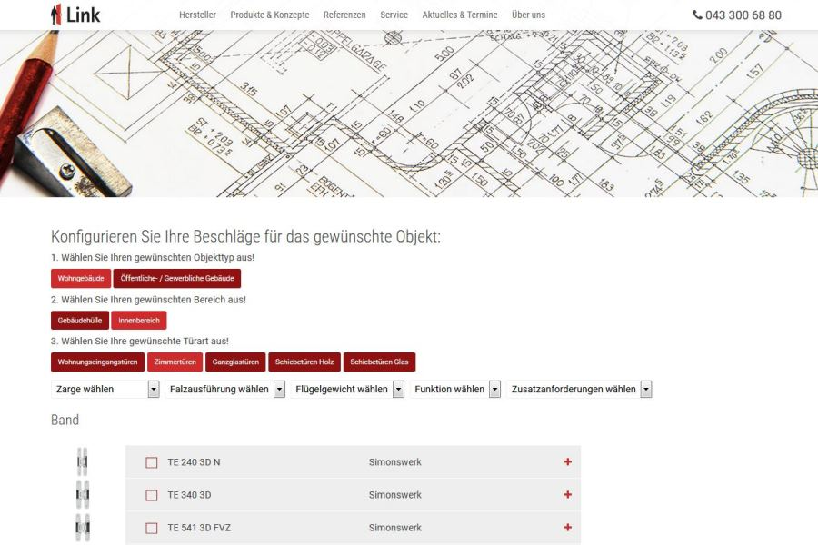 Der Beschlagplaner der Link Beschlagtechnik AG hat zur Steigerung der Nachverfolgbarkeit ein Facelifting erhalten. Die Bestimmung der Türen ist vereinfacht und klarer ersichtlich. Dadurch konnte die Nutzerfreundlichkeit deutlich gesteitert werden - die Auswahl der richtigen Beschläge ist einfacher denn je.