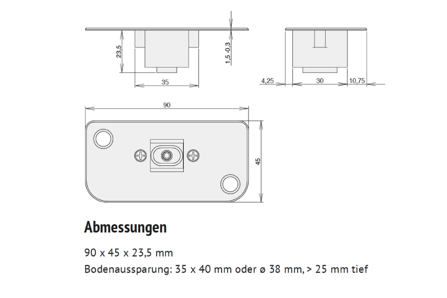 Die regulierbare Bodenschliessmulde von CardaTec, welche bei Standflügeln mit den Türdichtungen D1 und D2 eingesetzt werden kann, wurde bezüglich Montage optimiert. Neu reicht eine einzelne Bohrung mit Durchmesser 38 mm zur Vorbereitung der Installation, ohne weitere Bearbeitung des Bodens. Dank dieser Optimierung ist der Untergrund für die nächsten Schritte perfekt vorbereitet und die Installation ein Kinderspiel. Als Trennung von unterschiedlichen Bodenbelägen empfehlen wir Aluminiumtrennfugen.