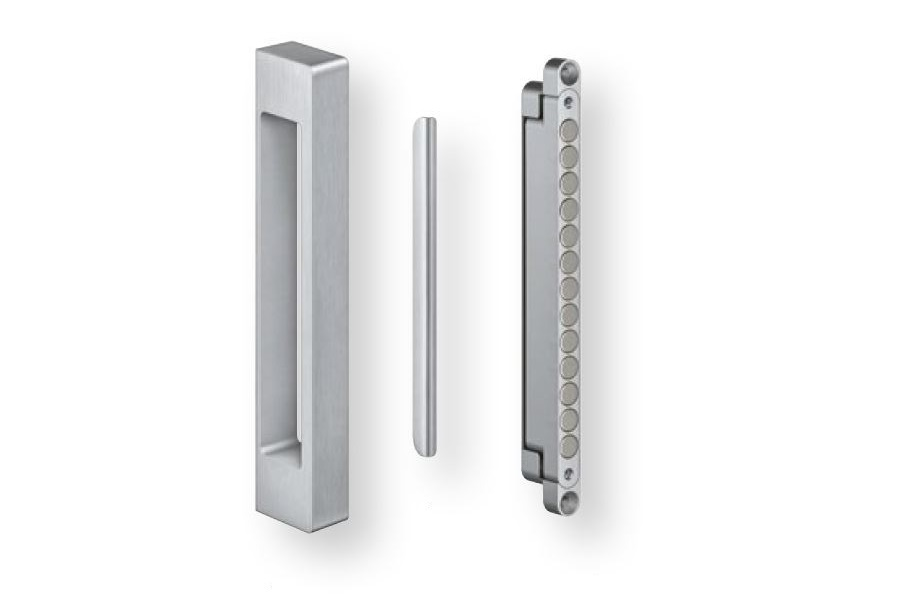 Der Schließmagnet KC 50 sowie die türseitige Magnetplatte KC 50/G ermöglichen einen kontakt- und geräuschlosen Schließvorgang, der auf das gewünschte Schließverhalten der Tür individuell angepasst werden kann. Komplettiert wird die Beschlaglösung durch eine auf Band und Element abgestimmte, formschöne Griffvariante. Der Einbau handelsüblicher schließseitiger Beschlagkomponenten ist ebenso möglich wie der Einsatz der seitens SIMONSWERK