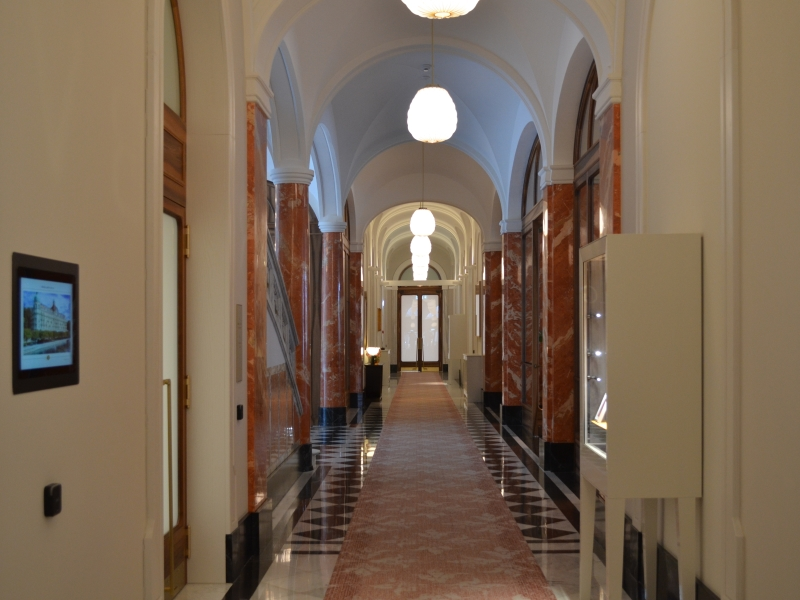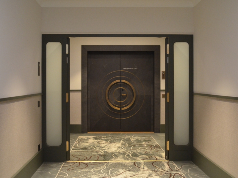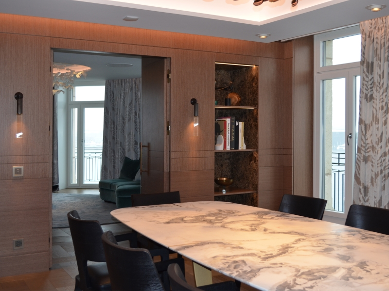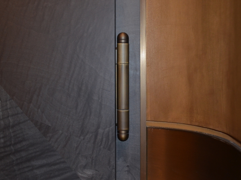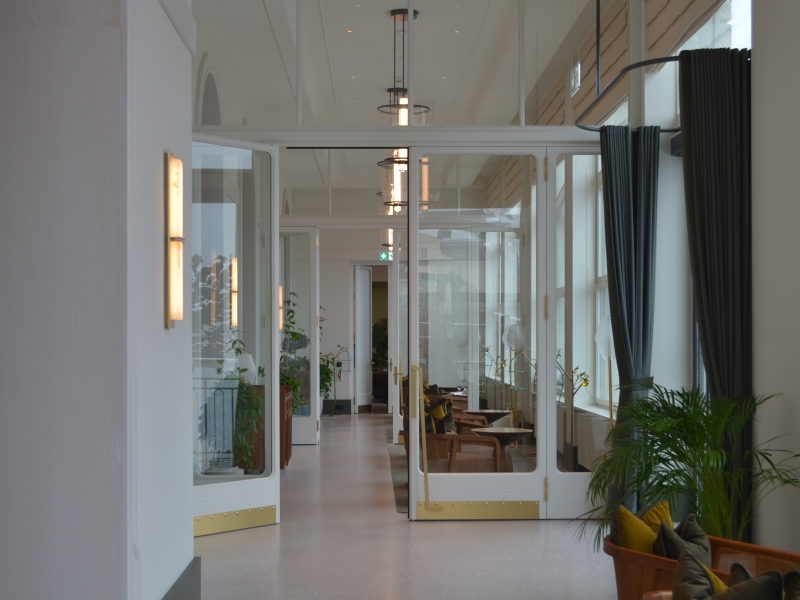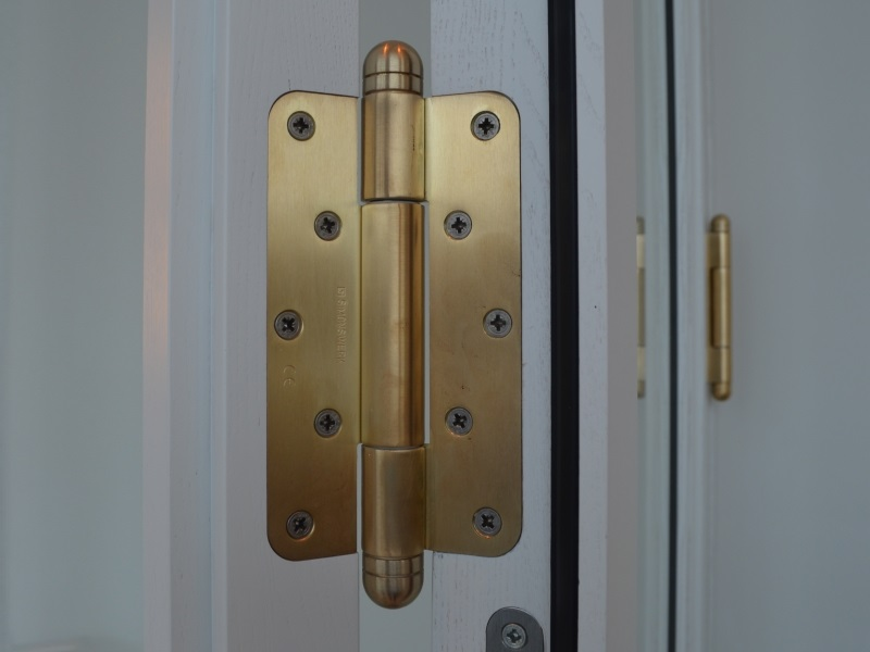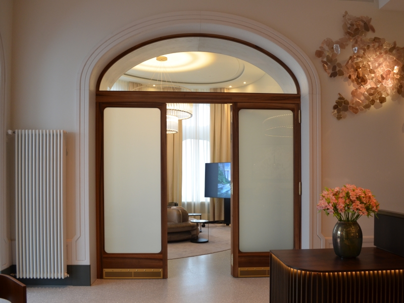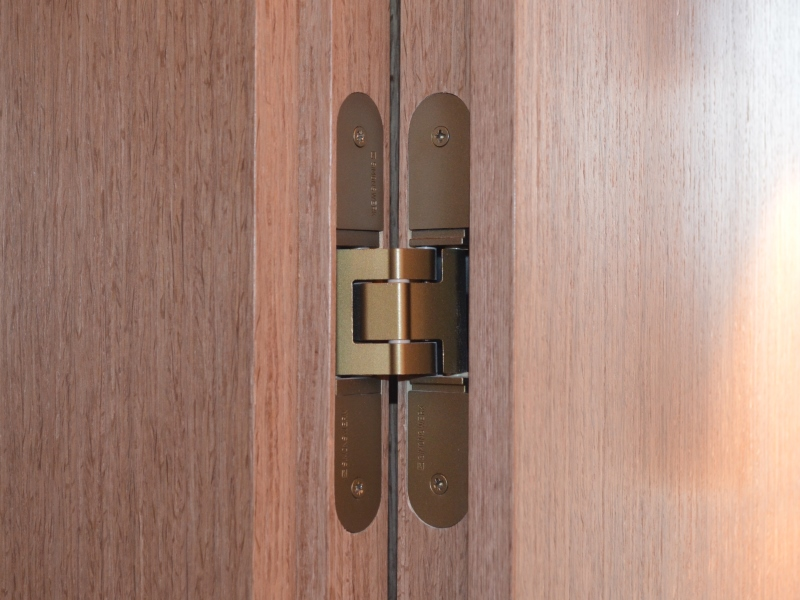Die Türelemente wurden mit viel planerischer Sorgfalt ins Gebäude integriert. Sämtliche Türen wurden mit Bändern aus dem Hause SIMONSWERK ausgestattet. Türen mit sichtbarer Bandrolle aus der VN- und VX-Familie wurden mit Rundkopf und vermessingter Oberfläche bestückt, im Backend in der Standardoberfläche Edelstahl matt gebürstet. Die Innentüren der Gästezimmer wurden mit verdeckt liegenden Bändern SIMONSWERK TECTUS versehen, deren bronzefarbene Oberfläche sich perfekt in die Materialisierung der Rahmen einfügt.