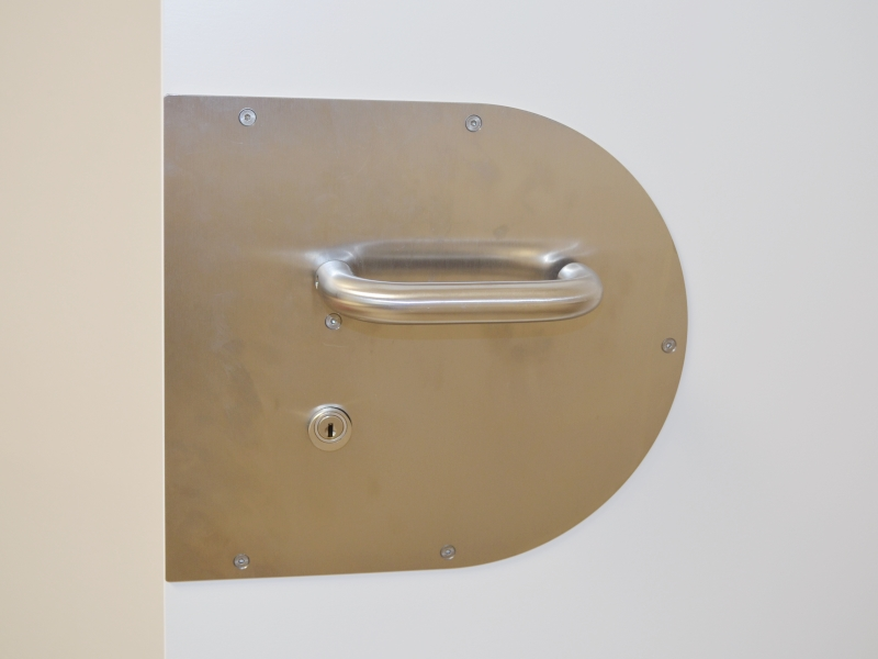 Garniturentechnisch bestand die Anforderung an einen Türschoner und die Drückerform HAFI 202. Die Türschoner wurden perfekt an die Falzgeometrien der Türen abgepasst und erhielten eine halbsichtbare Verschraubung, was die Ansicht auf Korridorseite deutlich aufwertet. Wie bei HAFI üblich wurden die Drücker fest drehbar auf den Schonern montiert und mit Hochhaltemechanik ausgestattet.