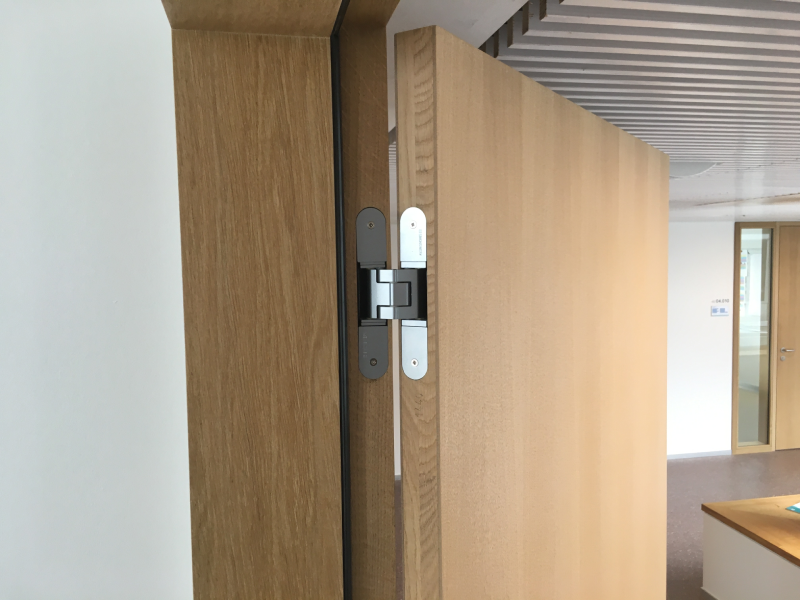 Im Bereich der Türenplanung wurden verdeckt liegende Bänder vorgesehen. Hier konnten die Türbänder SIMONSWERK TECTUS überzeugen. Bei den Büros und den Schulungsräumen wurde das TE 340 3D gewählt. Für die Brandschutztüren wurde auf das TE 540 3D zurückgegriffen. Alle Bänder sind in der Oberfläche F1 gehalten, teilweise wurde die Ausführung FR mit integrierten Brandschutzbildnern gewählt.